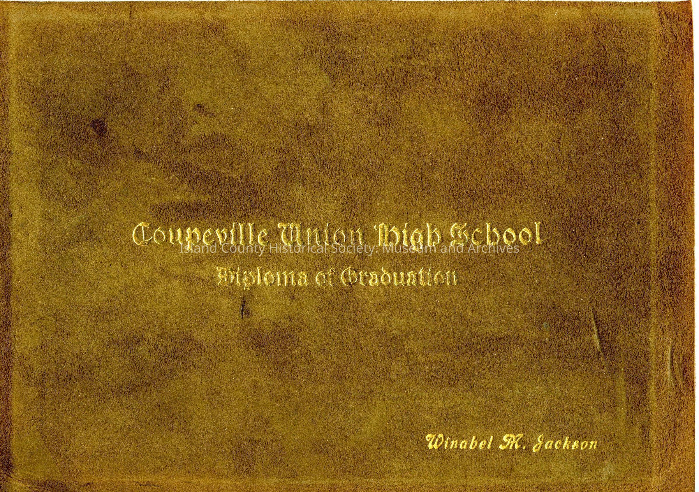 Coupeville Union High School. Diploma of Graduation. Winabel M. Jackson. Gold lettering on leather folder and inside is the certificate signed by school chairman A.L. Kineth