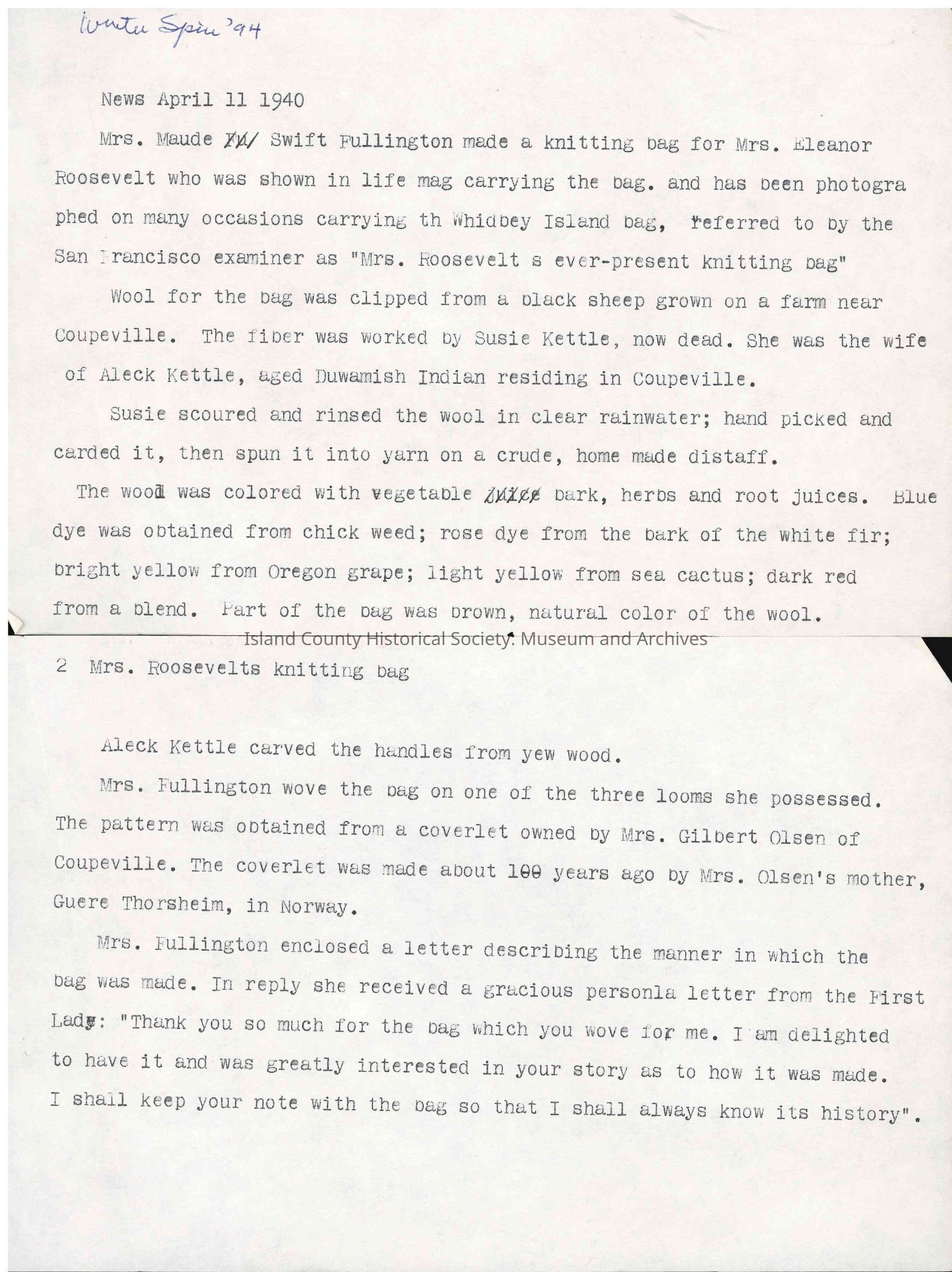 Information about the hand-woven bag given to Eleanor Roosevelt by Maude Swift Fullington. The wool was gathered and dyed by Susie Kettle. Eleanor Roosevelt wrote a "thank-you" letter to Maude Swift Fullington about the bag and was pictured/seen multiple times wearing the bag.