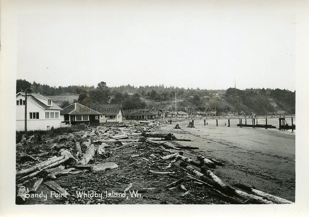 The black and white photo shows a view of Sandy Point on Whidbey Island. There are houses on a beach with a pier and several trees reside in the background.