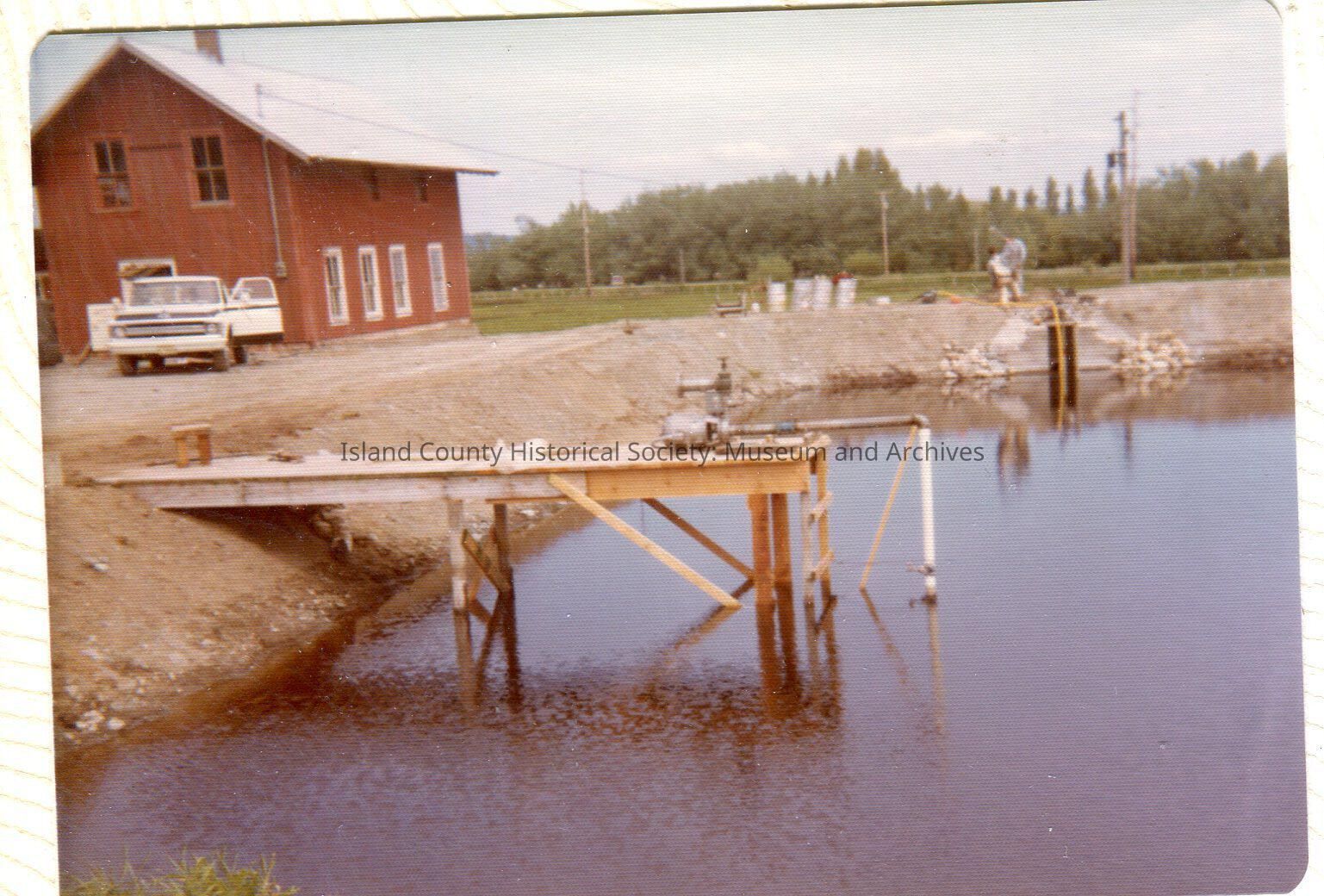 Newly created retention pond outside main barn at Greenbank Farm. Pier and equipment in foreground. Two workers are visible. Small barn and truck in background. Digital copy of Kawasaki photo.