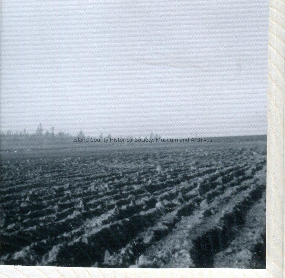 Black and white photo of furrowed field. Trees in background. Digital copy of Kawasaki photo.