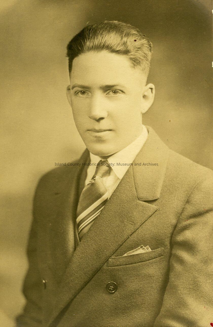 The black and white portrait is from the 1926 and 1927 Coupeville High School Graduation. The young man pictured is Burnell Dickinson.