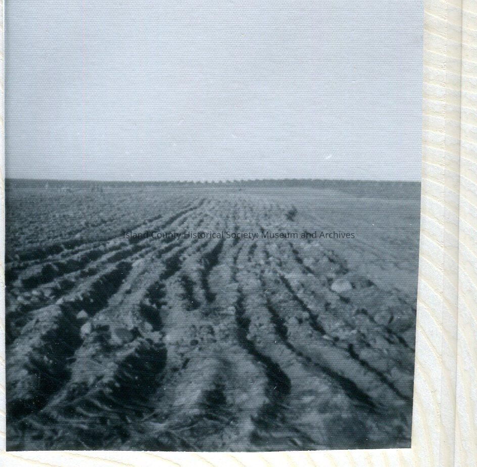 Black and white photo of furrowed field. Trees in background. Digital copy of Kawasaki photo.