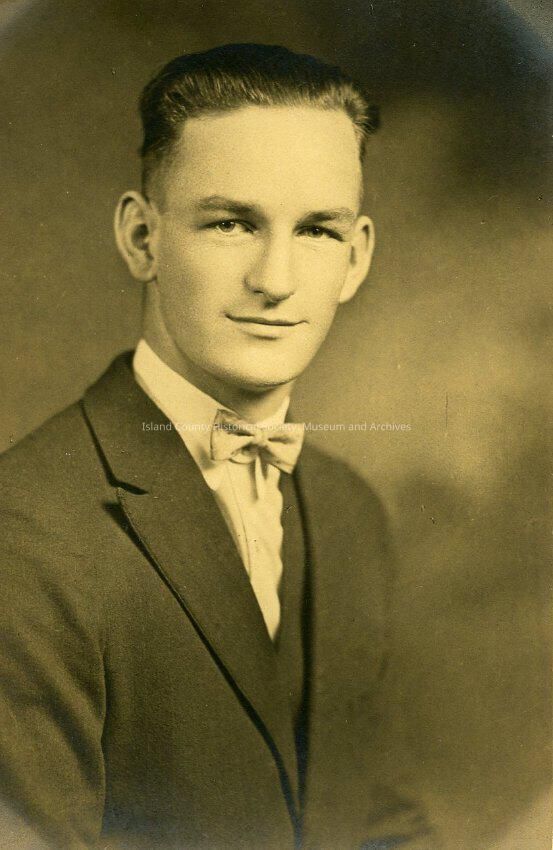 The black and white portrait is from the 1926 and 1927 Coupeville High School Graduation. The young man pictured is W. Dean Edmundson.