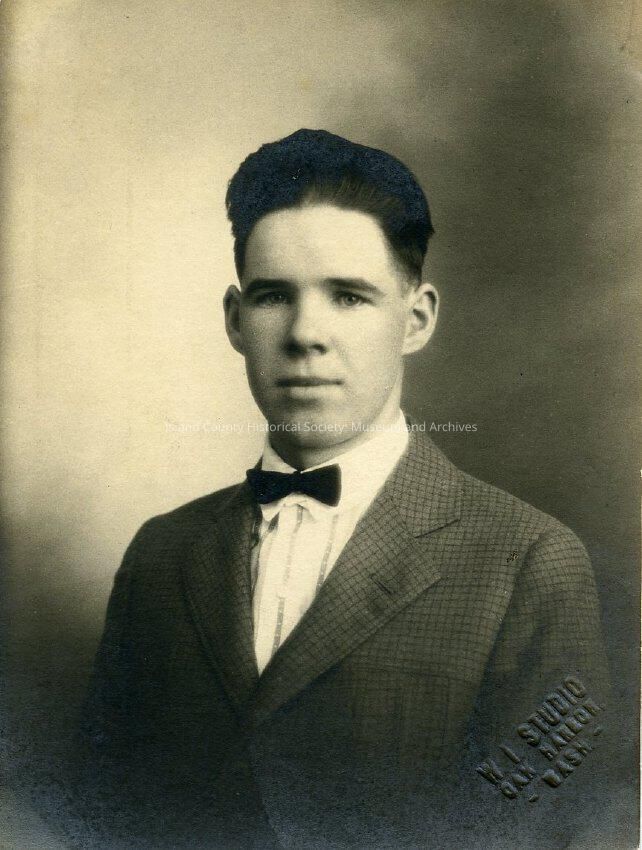The black and white portrait is from the 1926 and 1927 Coupeville High School Graduation. The young man pictured is Wesley Dickinson.