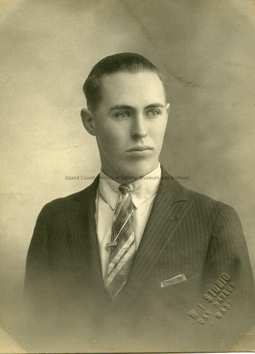 The black and white portrait is from the 1926 and 1927 Coupeville High School Graduation. The man pictured is unknown.