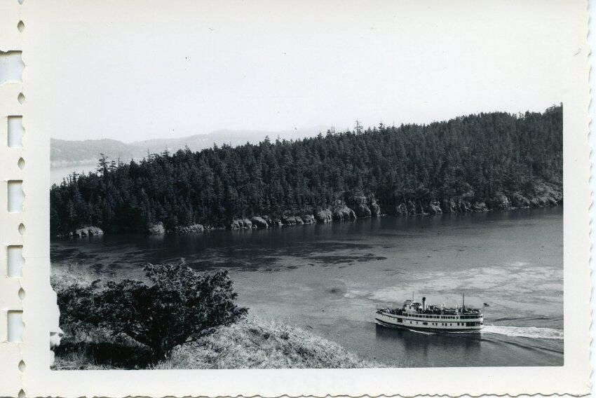 The black and white photo shows a ferry boat traveling across puget sound. Next to the ferry is an island covered in trees.