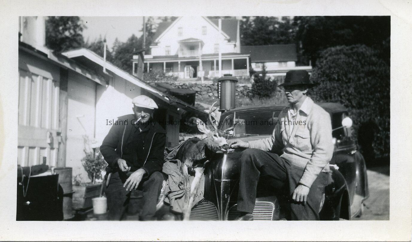 The black and white photo shows two men (one of them is smoking a cigarette) with hats (white and black) standind in front of a building and a car. On the back: At Orcas, WN. 1945. Stamped Mar 19, 1946.