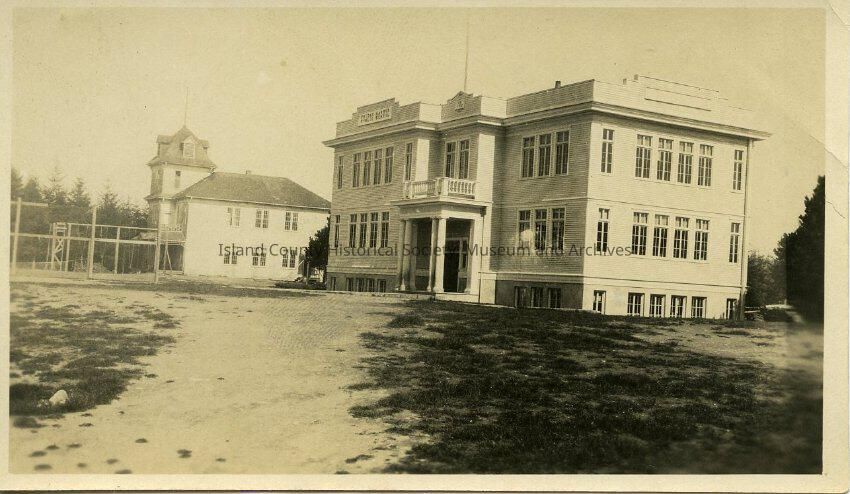 Black and white photo of Friday Harbor High School. The sign on the school says "Friday Harbor Public School". The school takes up the majority of the photo. There is also a smaller building to the left of the school. The bottom half of the photo is gravel and grass.