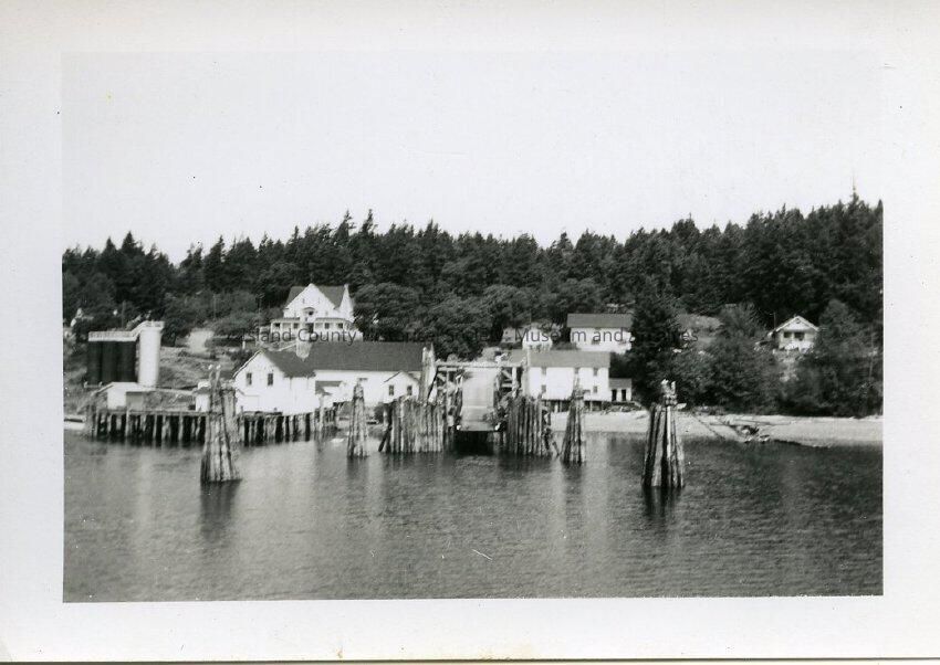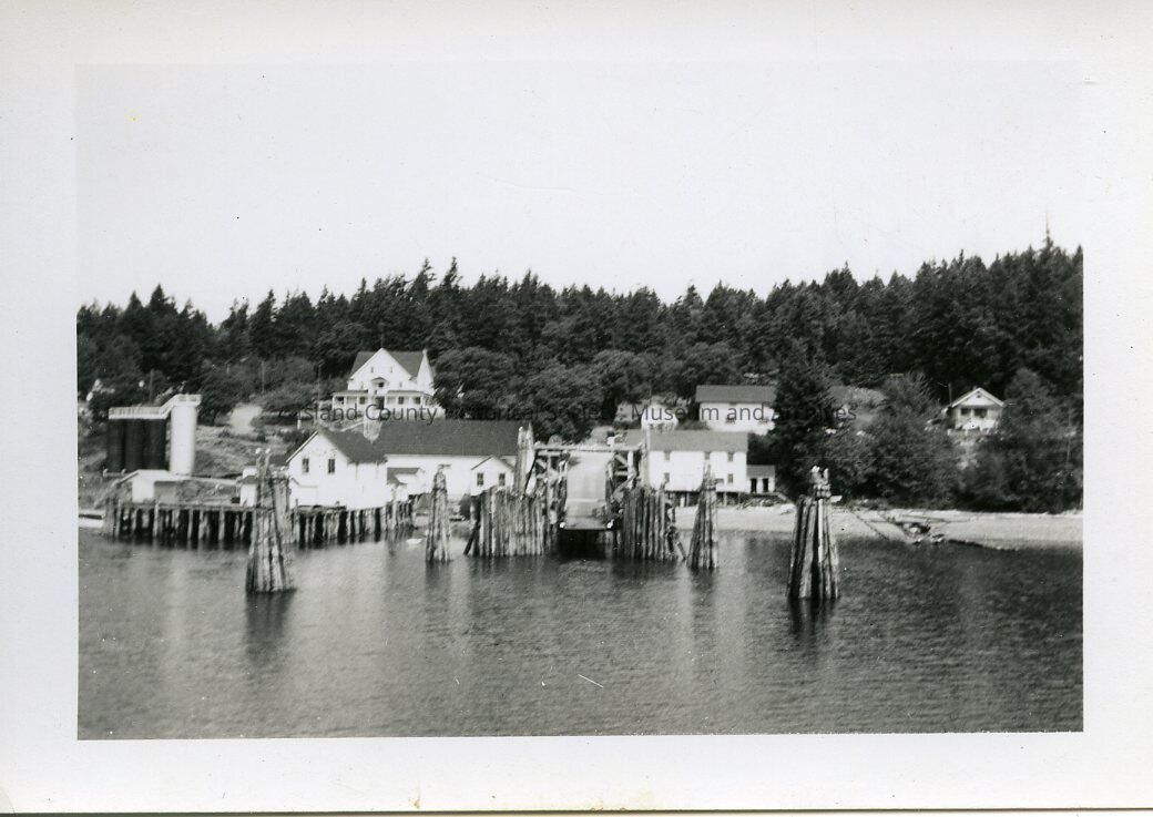 A black and white photo of a ferry terminal. The photo appears to be taken from the water, facing the land/dock. There are about 8 houses visable and there is a treeline behind/inbetween the houses. The foreground of the picture is the ocean. There are no people visiable in the photo.