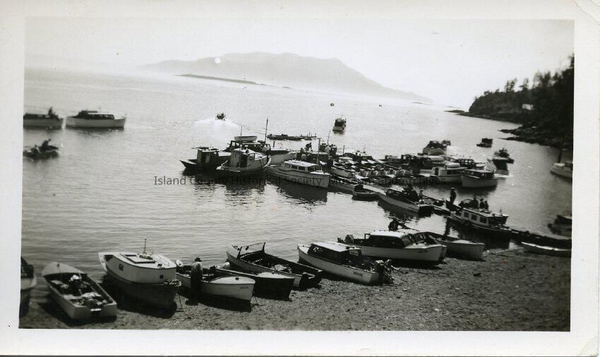 A black and white photo of 15-25 boats. The majority of the boats are beached, some are tied to a dock and a few others are out in the ocean. Only part of the beach is visiable on the bottom portion of the photo. You can see mountains in the far background. The back of the photo says, "some of the boats at the Salmon Derby, Aug. 24, 1941".Made/Created