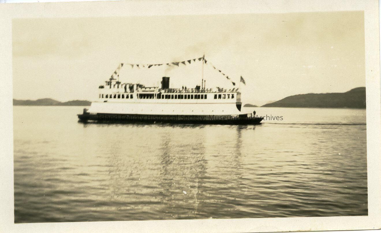 A black and white photo of a ferry in the ocean. There are no people visiable. The ferry has a banner of flags going from the front of the ferry to the back. There are islands visiable in the background. The back of the photo says "Ferry Rosario, Aug. 18-31".