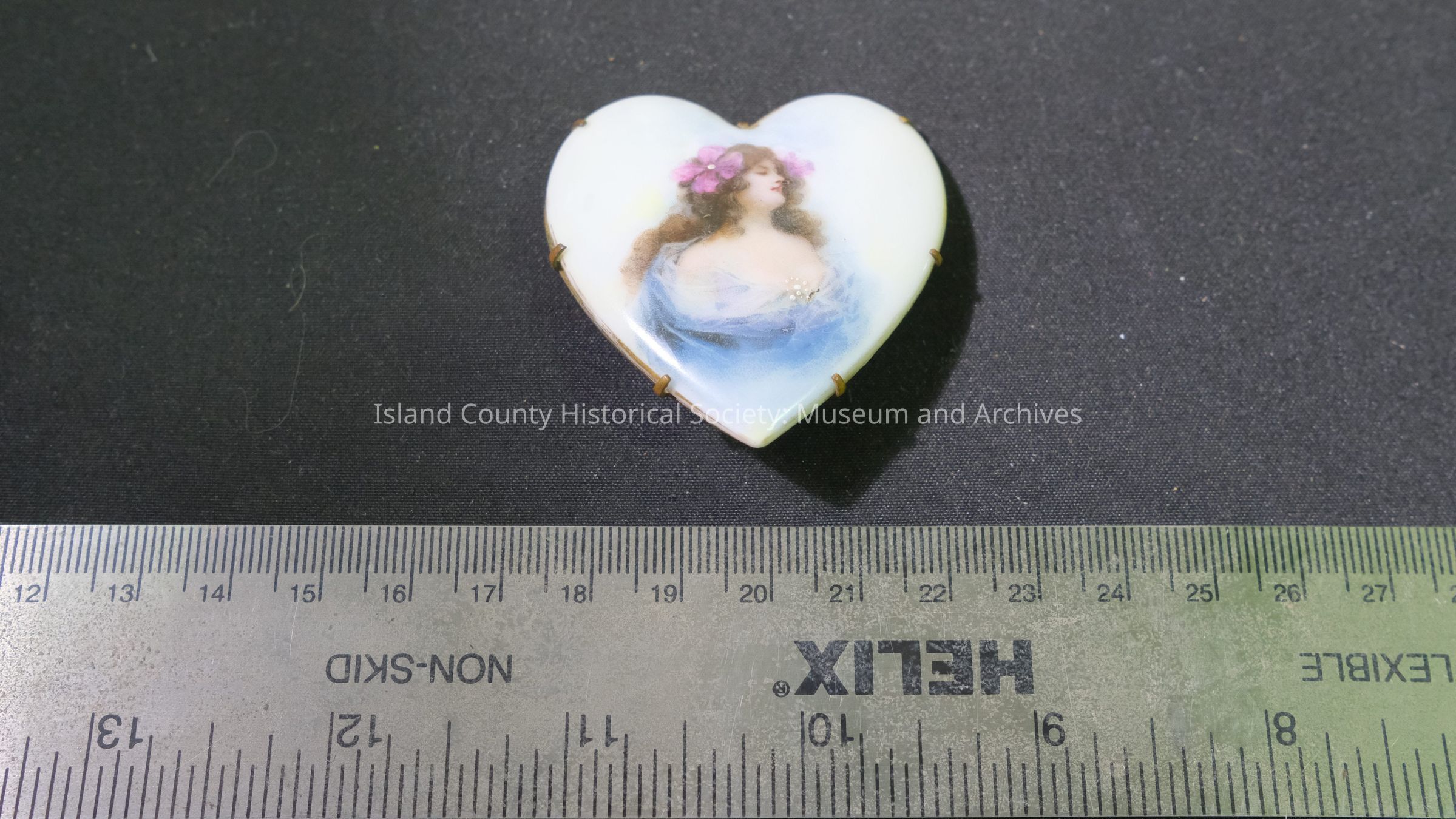 Heart-shaped brooch, china. Sideview - Girl with flowers in hair. Used by Ruby Hancock.