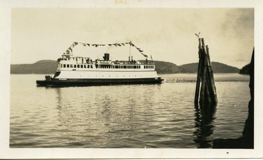 Black and white photo of a ferry in the water. The ferry has a banner of flags going from the front of the ferry to the back. There are islands visiable in the background. There is a group of piling in the water to the right of the ferry and a seagull perched on top. There are also some people visable on the ferry. The back of the photo says, "The Ferry Rosario on her initial trip April 18, 1931. Taken from Upright Head Ferry Landing".