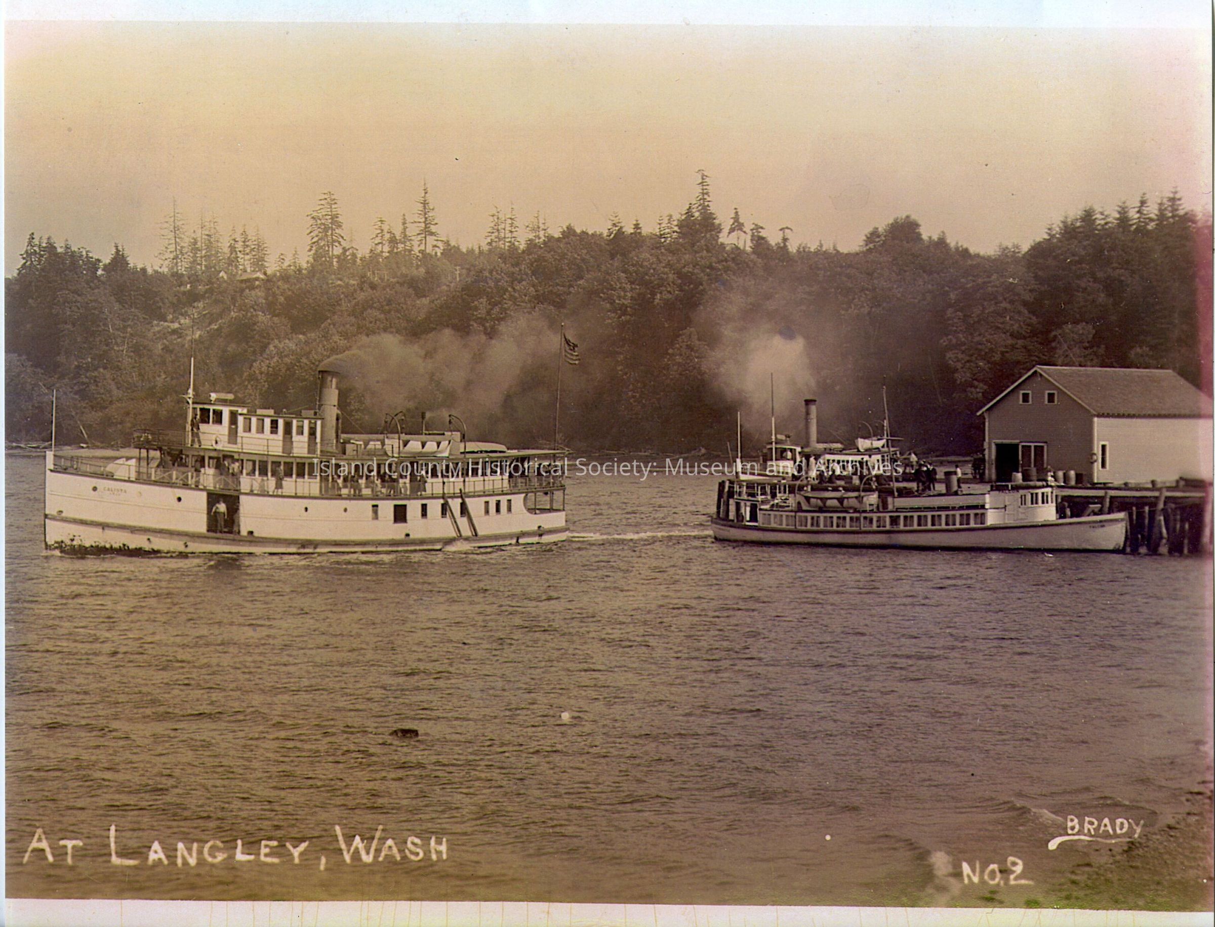 Photograph of the steamer "Calista" (left) departing Langley, c. 1911-1920. The steamboat docked at the wharf may be the Alvarene (undetermined) which later ran the San Juan Island route.Photograph Details