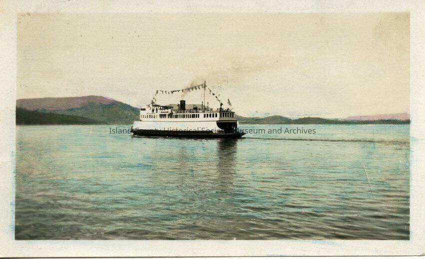 A black and white photo of a ferry in the ocean. The ferry is in the center of the ocean; the foreground is water and the backgound is the sky and islands. There is an American flag on the back of the ferry. The back of the photo says, "Ferry Rosario, Apr. 18, 1931".Made/Created