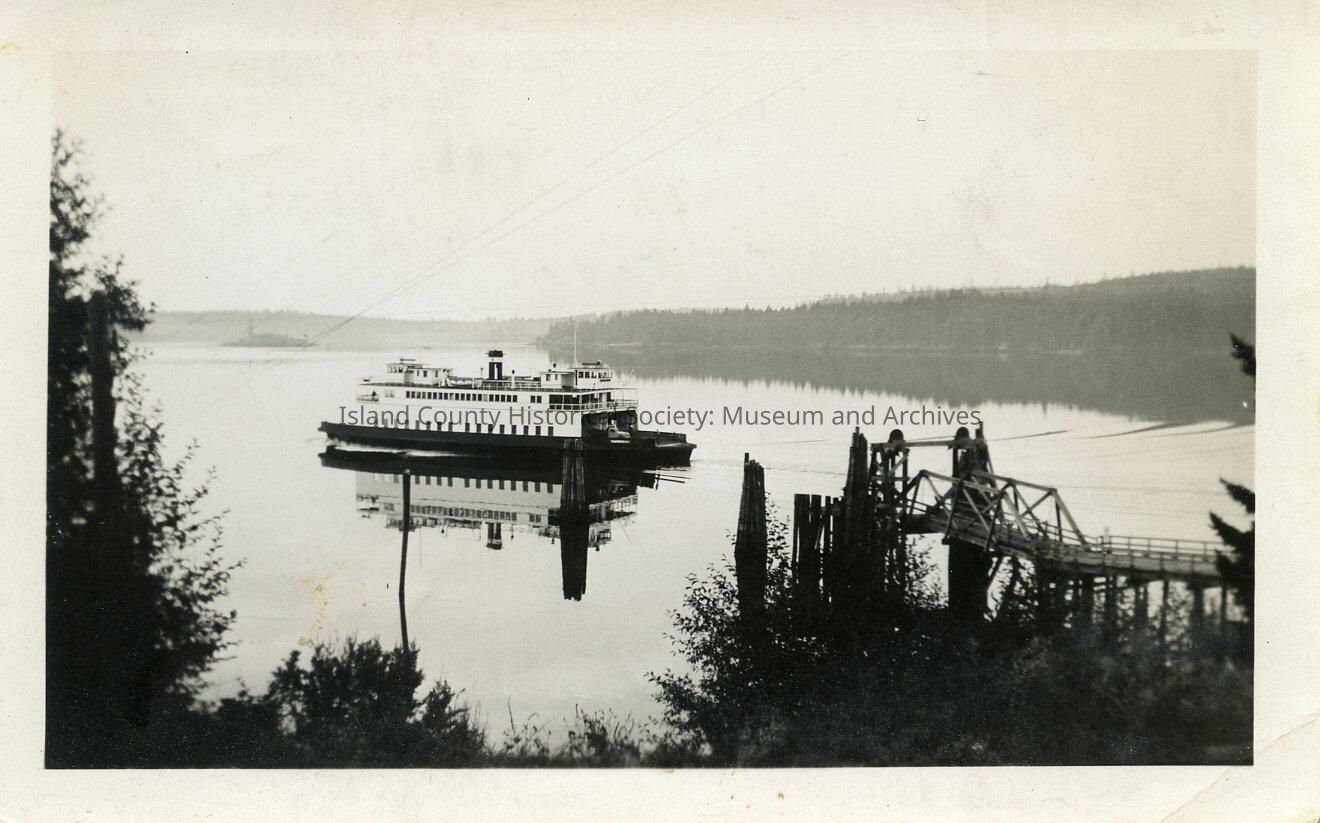 A black and white photo of a ferry leaving the terminal. The foreground is mostly trees while there are some islands visable in the background. The ferry is the in the center of the photo. The ferry terminal is on the bottom, right-hand side of the photo. On the back: Ferry Vashon - Harper at Orcas, Wash.
