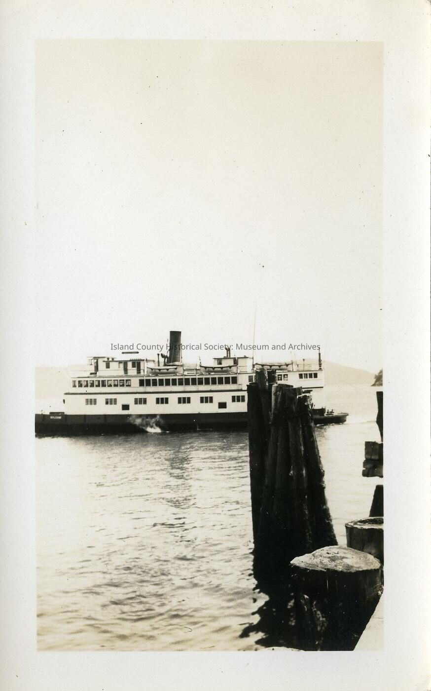 Black and white photo of a side-view of a ferry in the ocean. The foreground is water and piling and part of a dock on the right-hand side. There are some islands visiable in the background. Three lifeboats are visiable on the ferry.