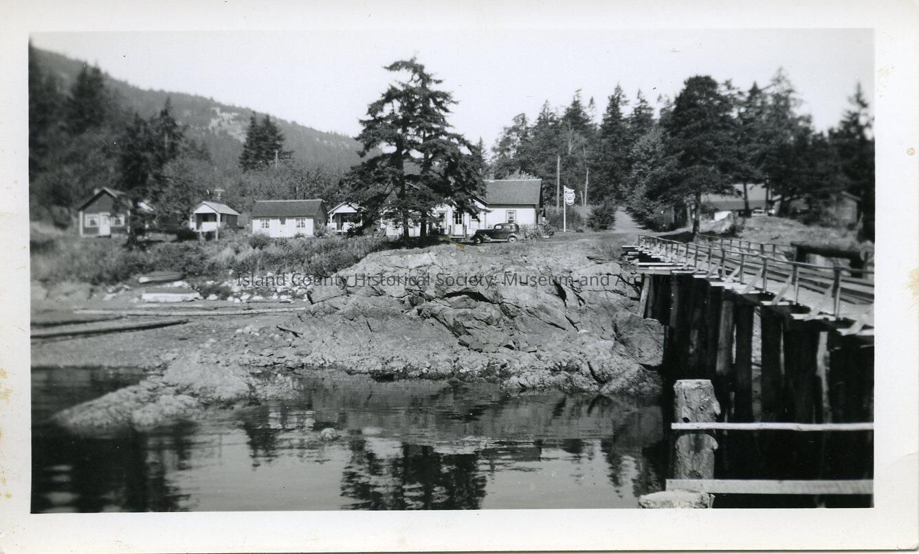 Black and white photo of a beach and some houses. The beach is very rockey. There are about 6 houses and two cars visiable in the background of the photo. The right-hand side of the photo is a pier. There are also many trees visiable in the photo, some of which are blocking part of the houses.