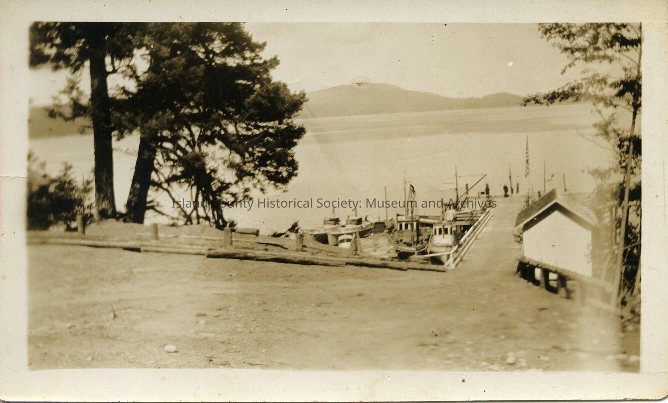 Black and white photo of a ferry landing. The back of the photo says, "Lopez Island Ferry Landing. Taken the day of the great celebration. Celebrating the landing of the first ferry but no ferry landed. Sunday May 30, 1926". The foreground of the photo is the gravel road leading to the ferry and the background is the ocean and islands. There is no ferry visiable in the photo. There are about eight boats tied to the pier.