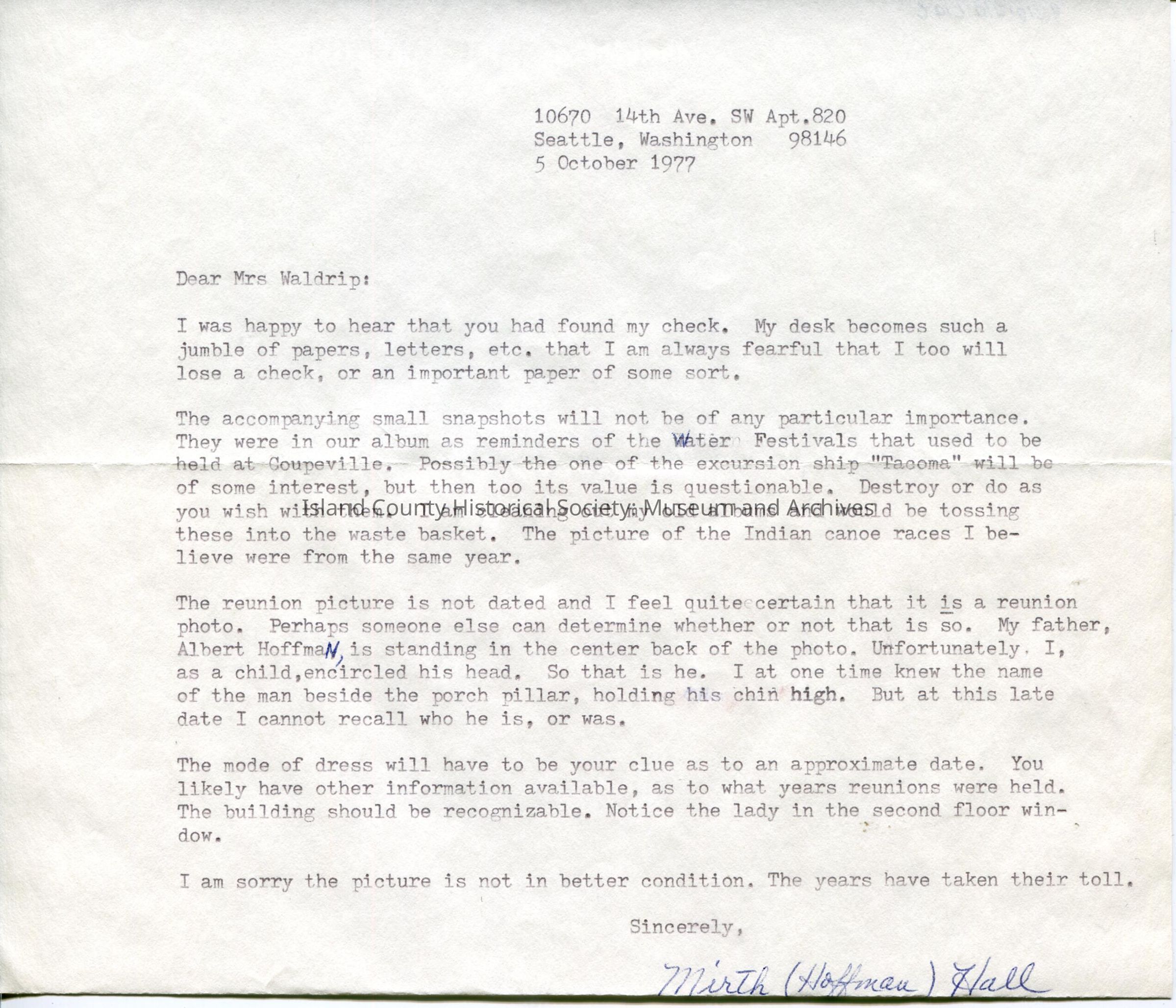 There is also a letter that came with this photo dated October 5, 1977 and is to Mrs, Waldrip from Mirth (Hoffman) Hall.