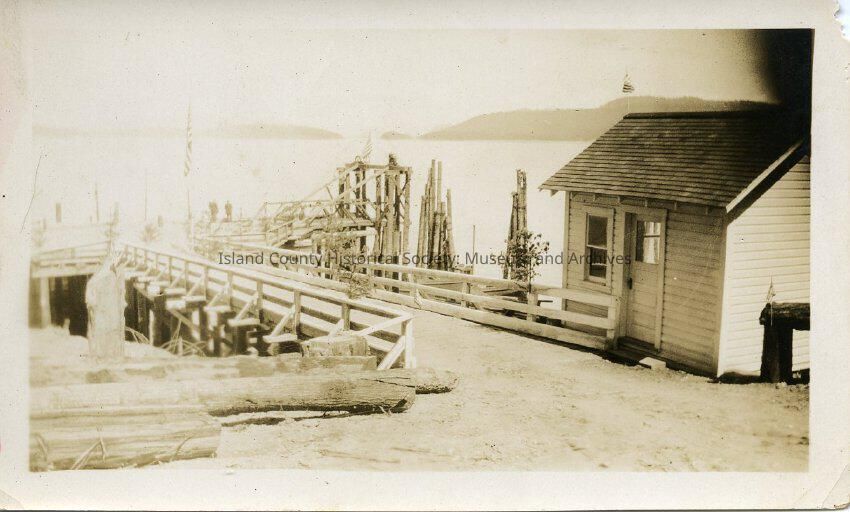 Sepia photo of a ferry terminal. The ocean and some islands are visiable in the background. There are two people visiable at the end of the pier near an American flag. There is no ferry at the terminal or in the ocean. The foreground of the photo is the gravel road leading to the ferry terminal.