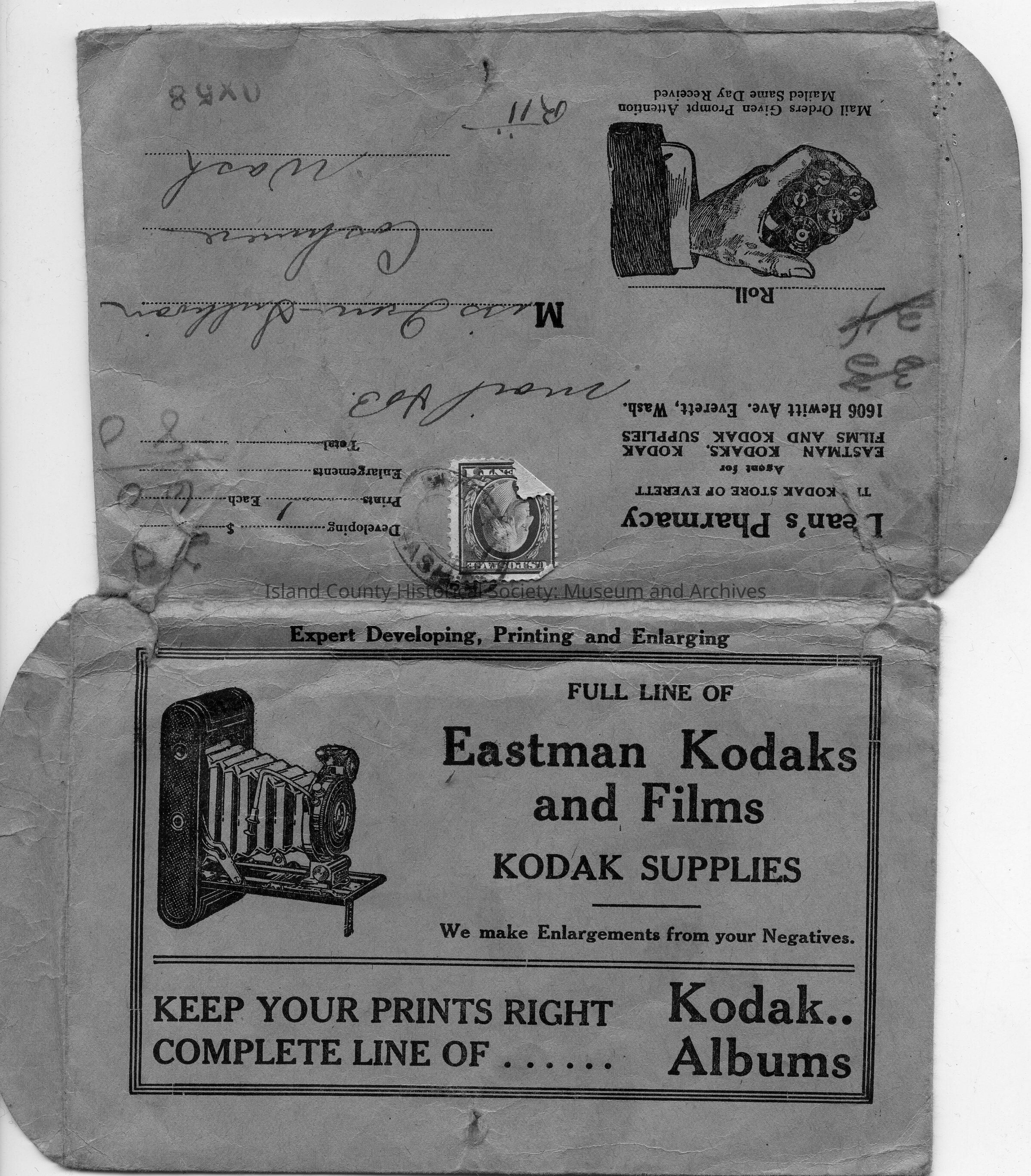 Kodak mailer envelope from Lean's Pharmacy in Everett, Wash. One cent postage stamp. Date not readable. Addressed to: Miss Irene Sullivan Cashmere, Wash