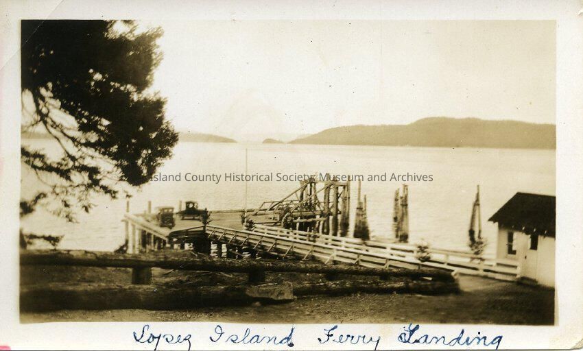 Sepia photo of the Lopez Island ferry landing. There is no ferry or people visiable in the photo. There are two vehicles at the end of the pier. The background of the photo is the ocean and islands. There is one large tree on the left-hand side of the photo. On the front: Lopez Island Ferry Landing.