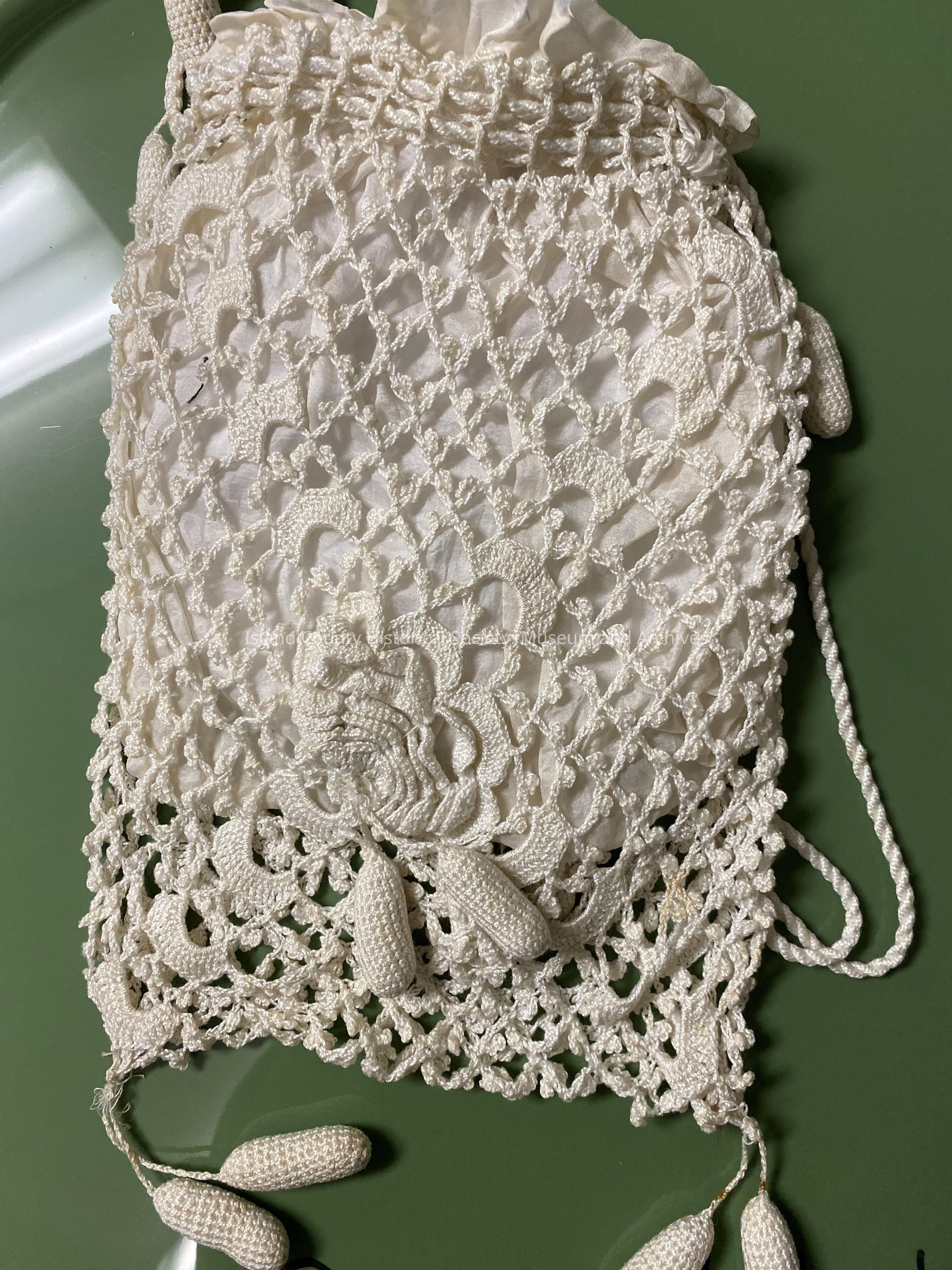 White crocheted reticule. Mrs. Shirley Parker. From 503 entry: Cream satin lining with cream crochet covering. Four tassels hanging from base with two pull closure.