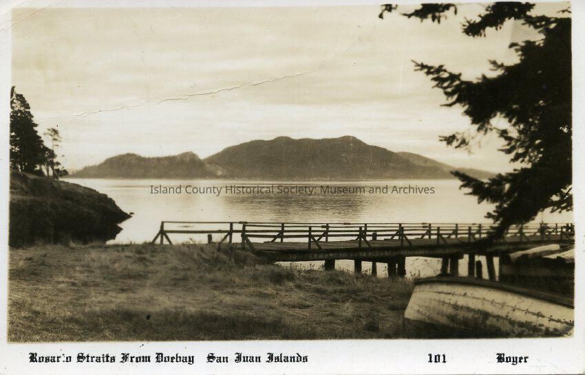 Black and white postcard. The postcard says, "Rosario Straits from Doebay, San Juan Islands". The photo is of a pier with the ocean and islands in the background. There is a canoe or small boat on the grass in the lower, right-hand corner of the picture. EKC postcard issued: 1930-1950.Made/Created