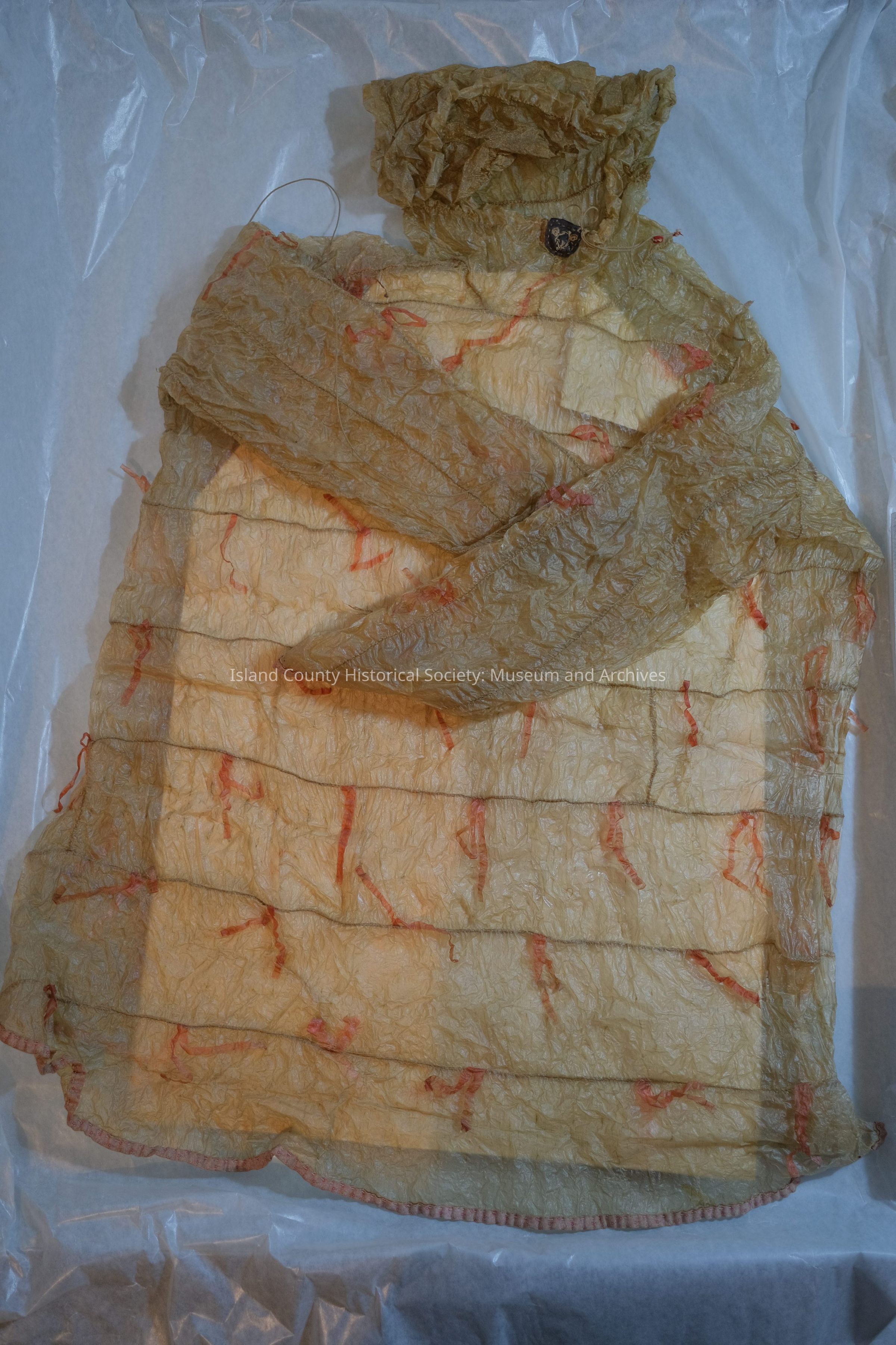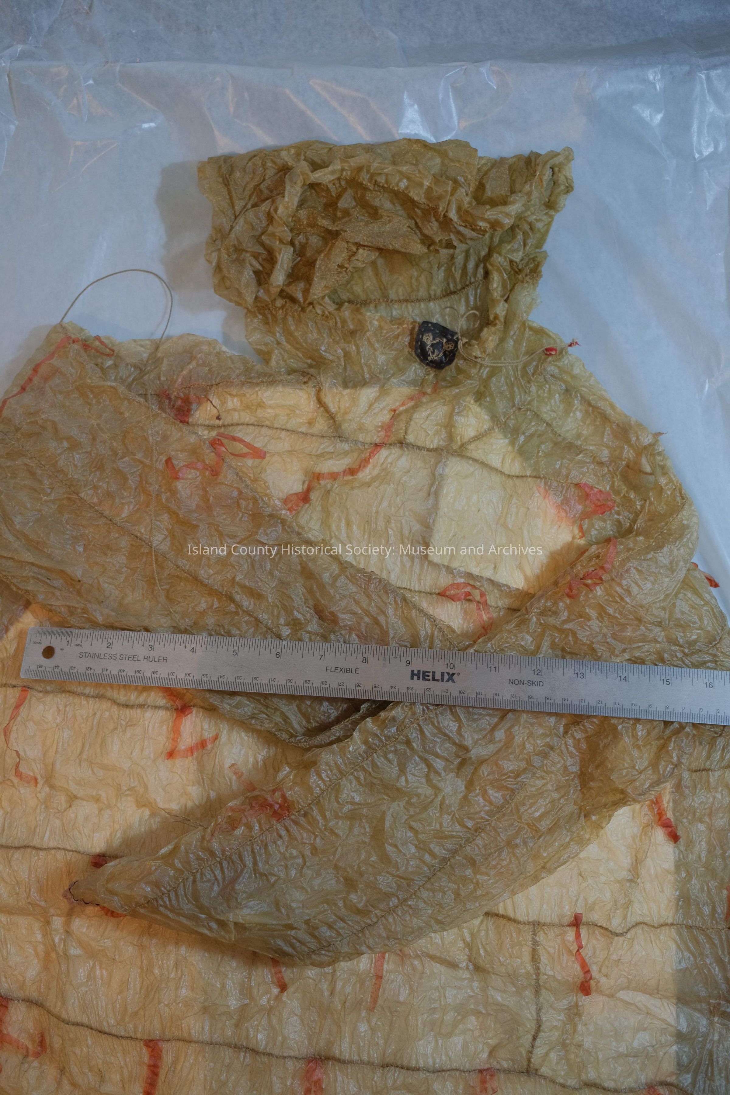 Kamleika raincoat made by Attu Tribal People; made of sea lion intestine, dyed red streamers are sewn in to frighten away evil spirits of weatherCollection