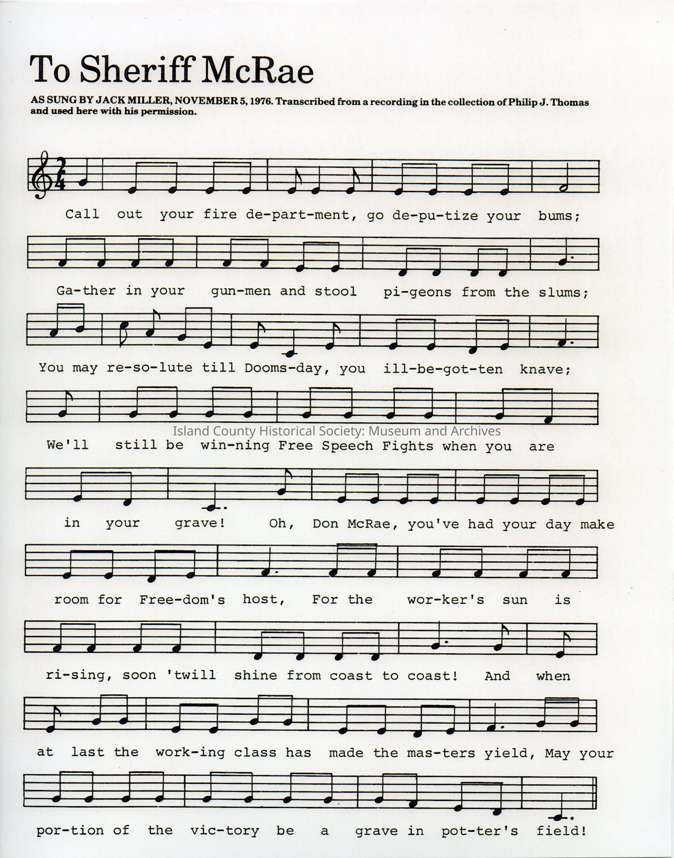 Photograph of sheet music written titled "To Sheriff McRae", a song referencing the Everett Massacre of 1916, which involved Sheriff McRae and the Industrial Workers of the World (IWW) Union.