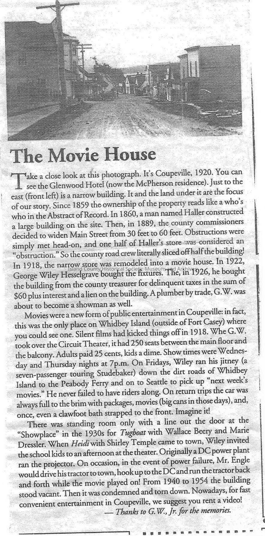 photocopy of article "The Movie House" -- Circuit Theater in Coupeville, WA