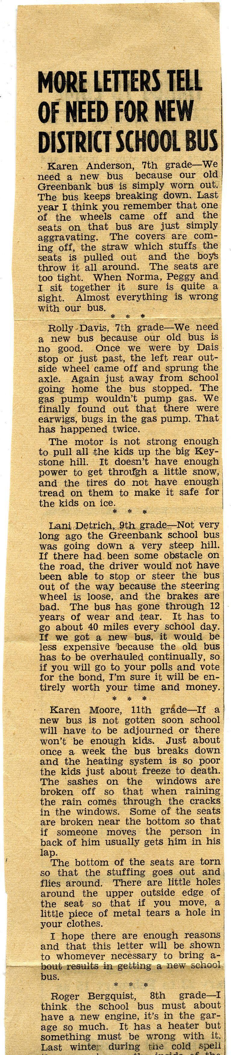 Newspaper clipping. "More Letters Tell of Need for New District School Bus". Prints student letters to the newspaper pleading the district government for a new school bus. One letter is by Karen Anderson (later Karen Riston) when in 7th grade. Other letter writers: Rolly Davis, Lani Dietrich, Karen Moore and Roger Bergquist.