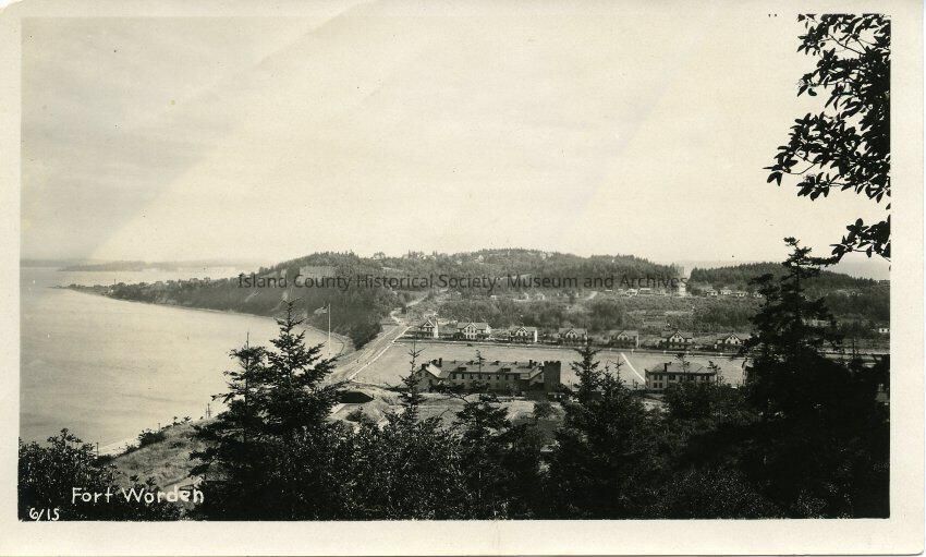 Black and white photo shows a view of Fort Worden.