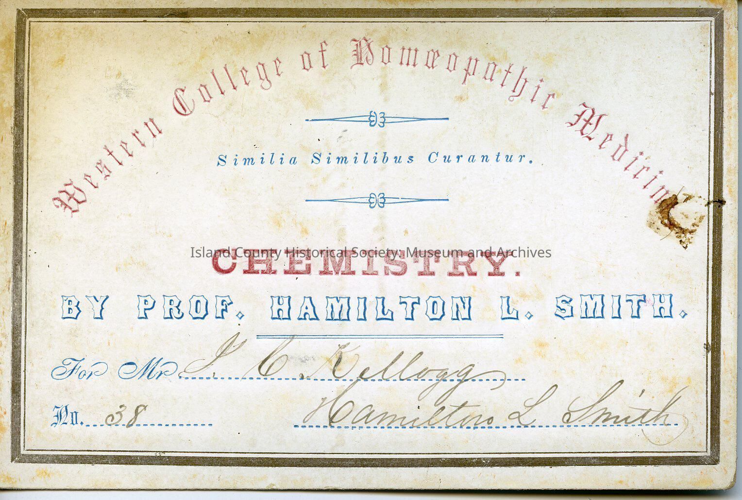 Written on the front "Western College of Homeopathic Medicine. Similia Similibus Curantur Chemistry By Prof. Hamilton L. Smith For Mr. John C Kellog No 38 Hamilton L. Smith"