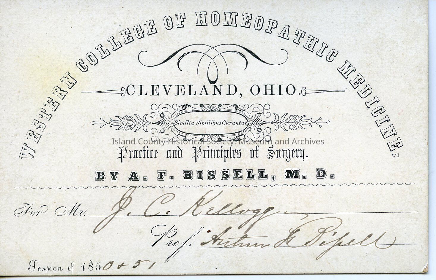 Written on the front "Western College of Homeopathic Medicine. Cleveland, Ohio Practice and Pricipal of Surgery By A.F. Bissell, M.D. Session of 1850-1851 For John C Kellogg Signed by Prof Arthur F Bissell"
