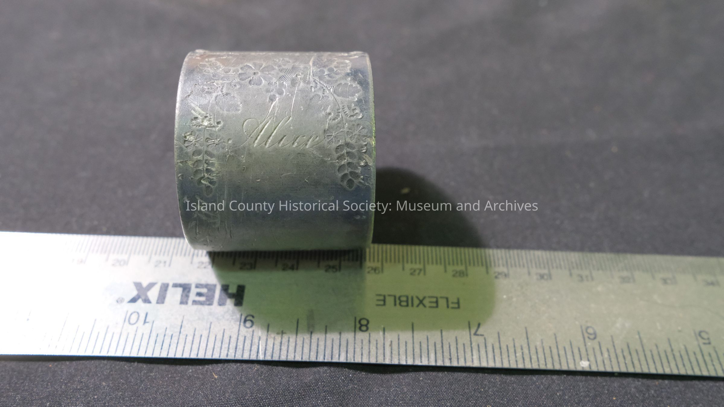 Silver napkin ring. Alice (Cahail). One silver napkin ring with floral design and engraved "Alice".