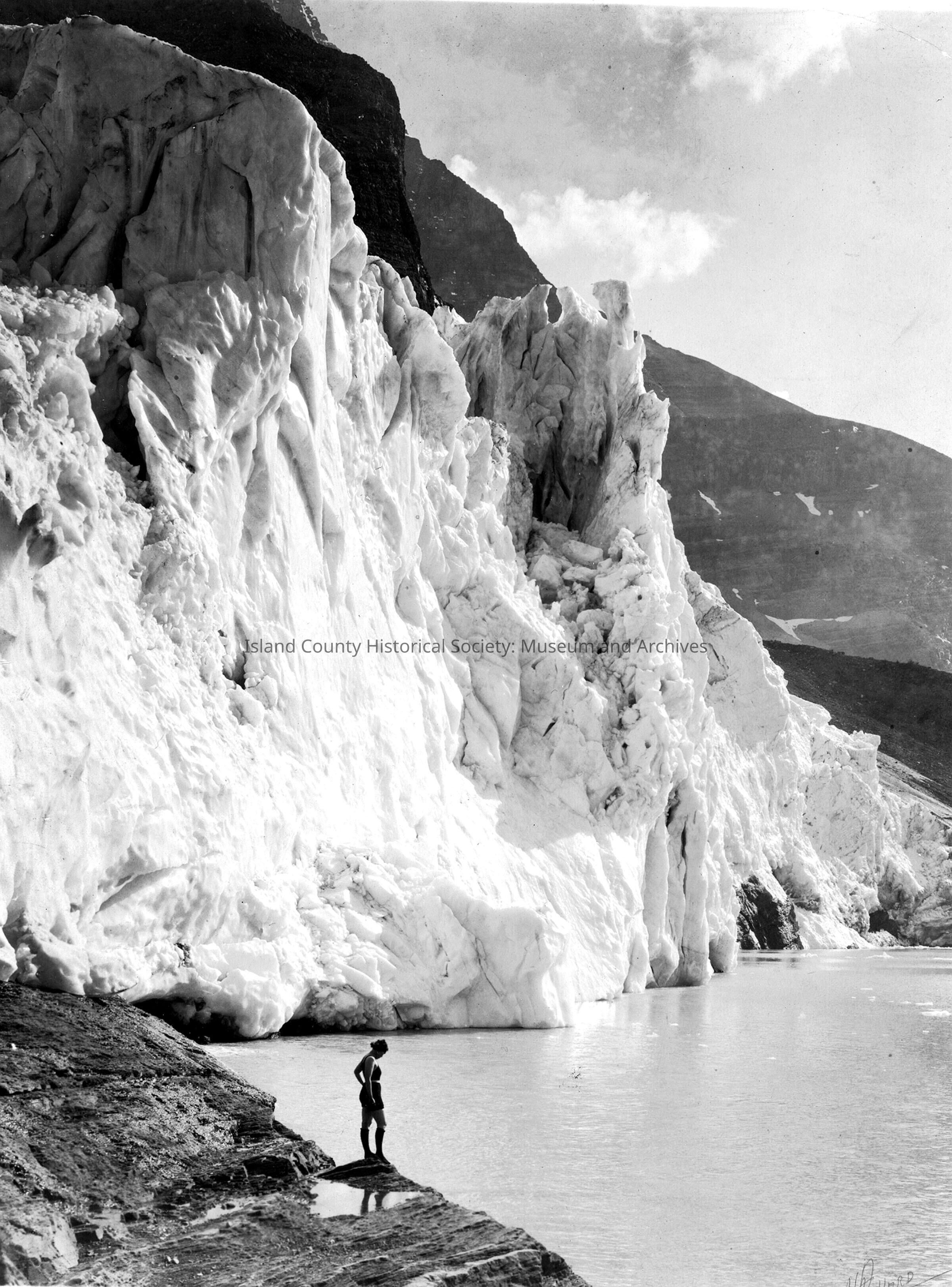 Tumbling Glacier with woman in foreground. Message on back.