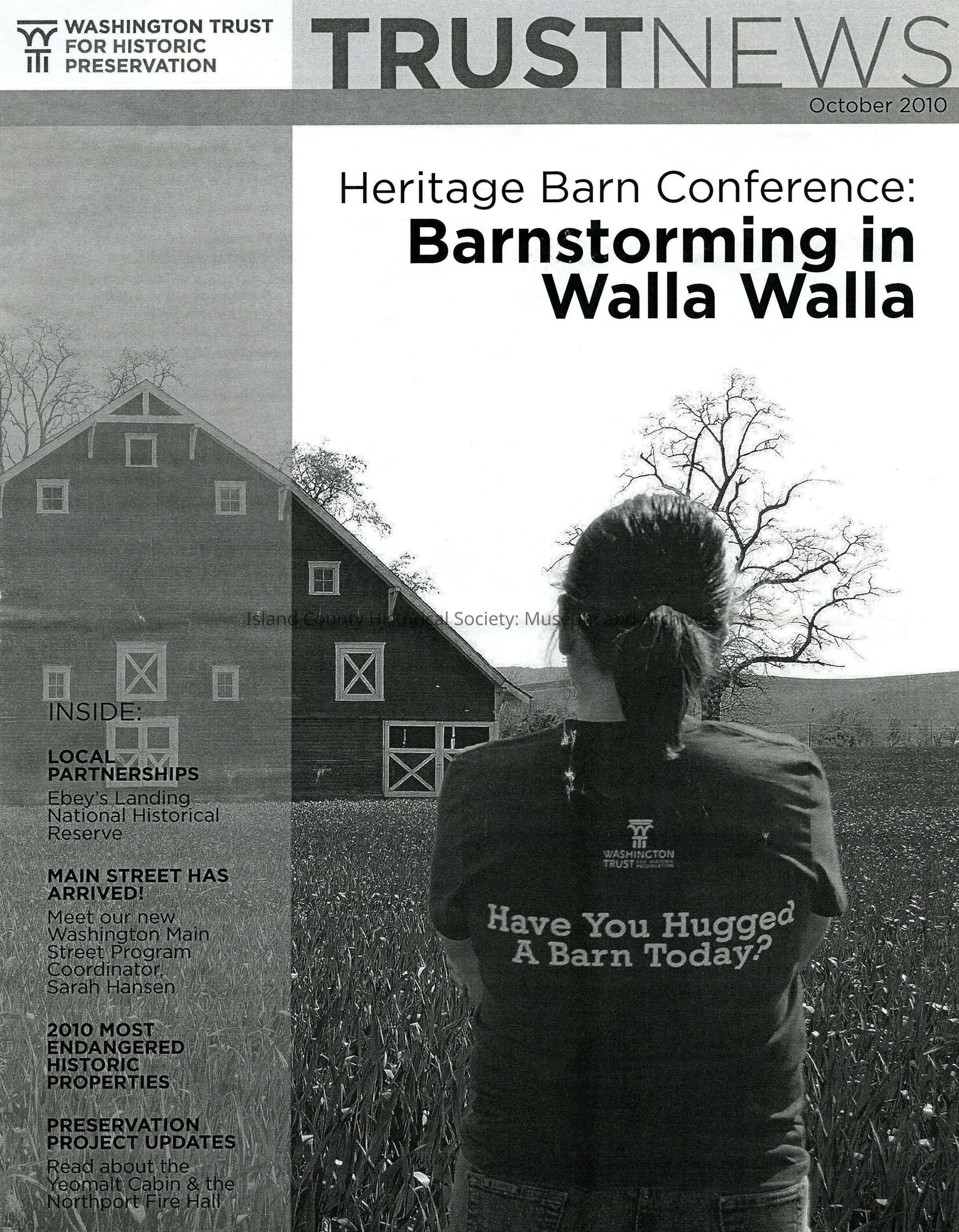 Washington Trust for Historic Preservation Trust News October 2010 edition. Entitled: Heritage Barn Conference: Barnstorming in Walla Walla. 1 piece of A3 paper, folded in half and printed on four sides. In black and white. On front page is photo of barn with woman's back towards camera, wearing a t-shirt with the slogan: "Have You Hugged A Barn Today?". Second and third page are a single article: "Have you hugged a barn today" giving an overview of the Heritage Barn Conference and a brief biography of the "Kibler Barns". Last page (page 8 so called) finishes the previous article and has another smaller article: "Documenting and preserving Washington's agricultural heritage".