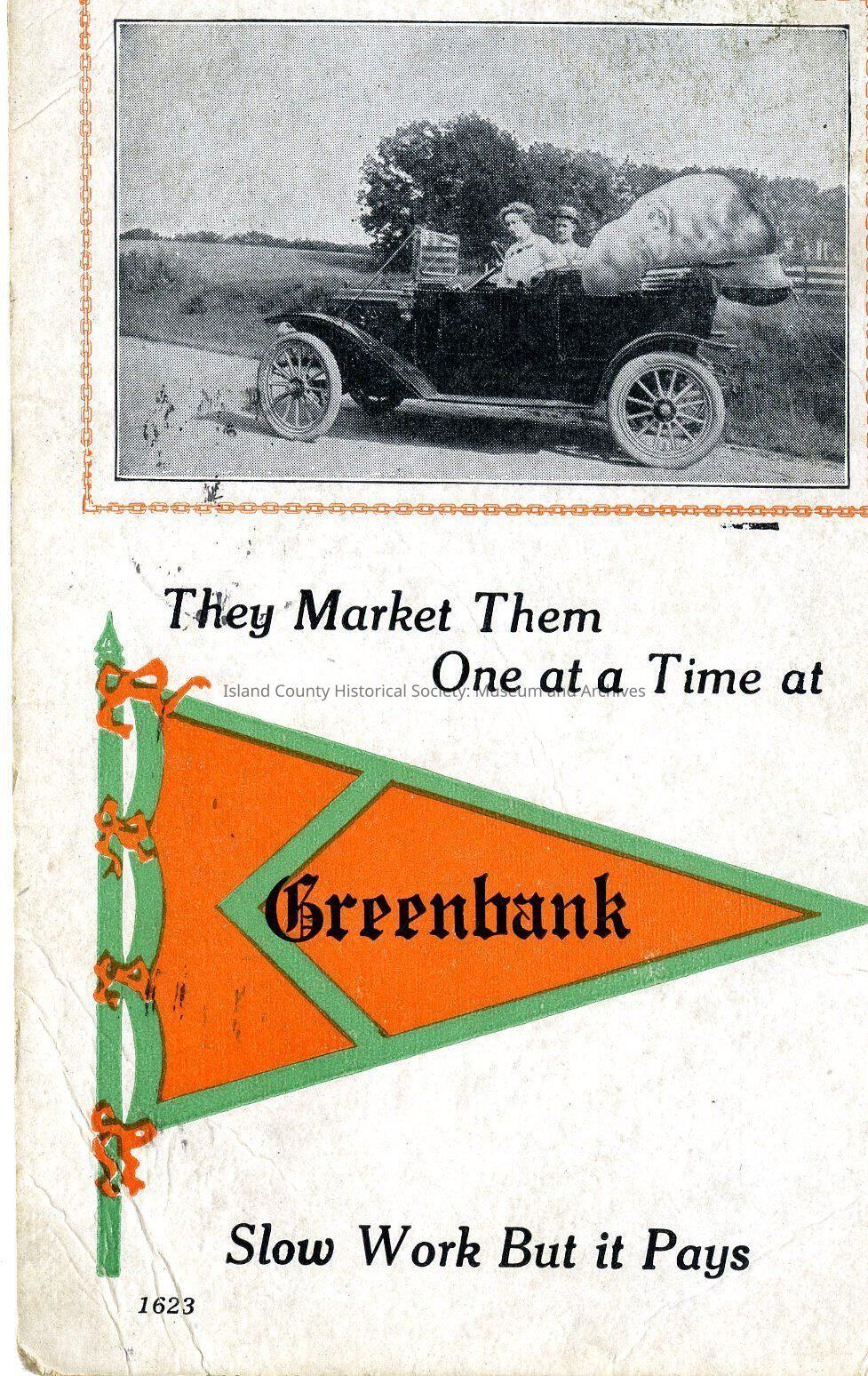 Postcard with slogan: "They Market Them One at a Time at Slow Work But it Pays". Numbers on bottom: "1623". In a orange border at the top is a photo of a man and woman in an early 20th century automobile. A huge superimposed image of a potato (?) is in the back seat. Behind them is a field and a line of trees. On the back is a 1 cent green stamp. Dated March 14th (?) 1920 (?). Postcard is addressed to Miss Elli Sandstrom in Seattle. Writing in faint pencil, in Finnish, and mentions Walter (Autio, presumably) at the end.Lexicon