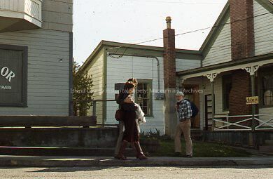 Filming of 1982 film "Cry For The Strangers" in Coupeville, WA. The name "McPherson" is written on the slide holder. Local resident Jack McPherson walks toward couple near old Glenwood hotel, called "Harbor Inn" in movie.