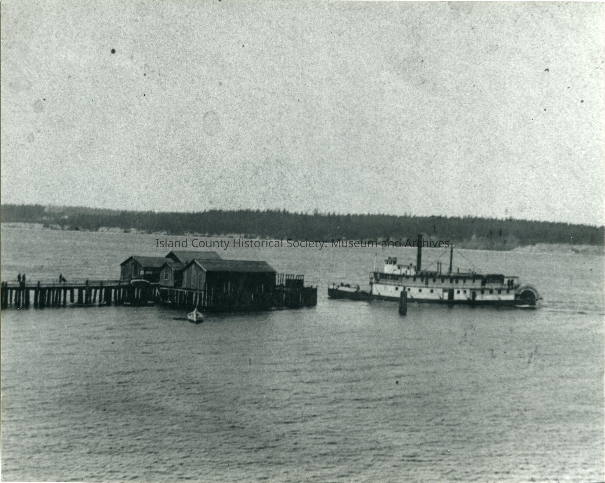 Photo of the Roberstons wharf in Coupeville, now gone. There are several large buildings on the wharf. A small boat is on foreground of the pier. A large steamer ferry is tied up at the wharf. People are walking along the pier and are on the ferry. On the back: Robertson Dock - middle one of three Coupeville, with "Fairhaven"