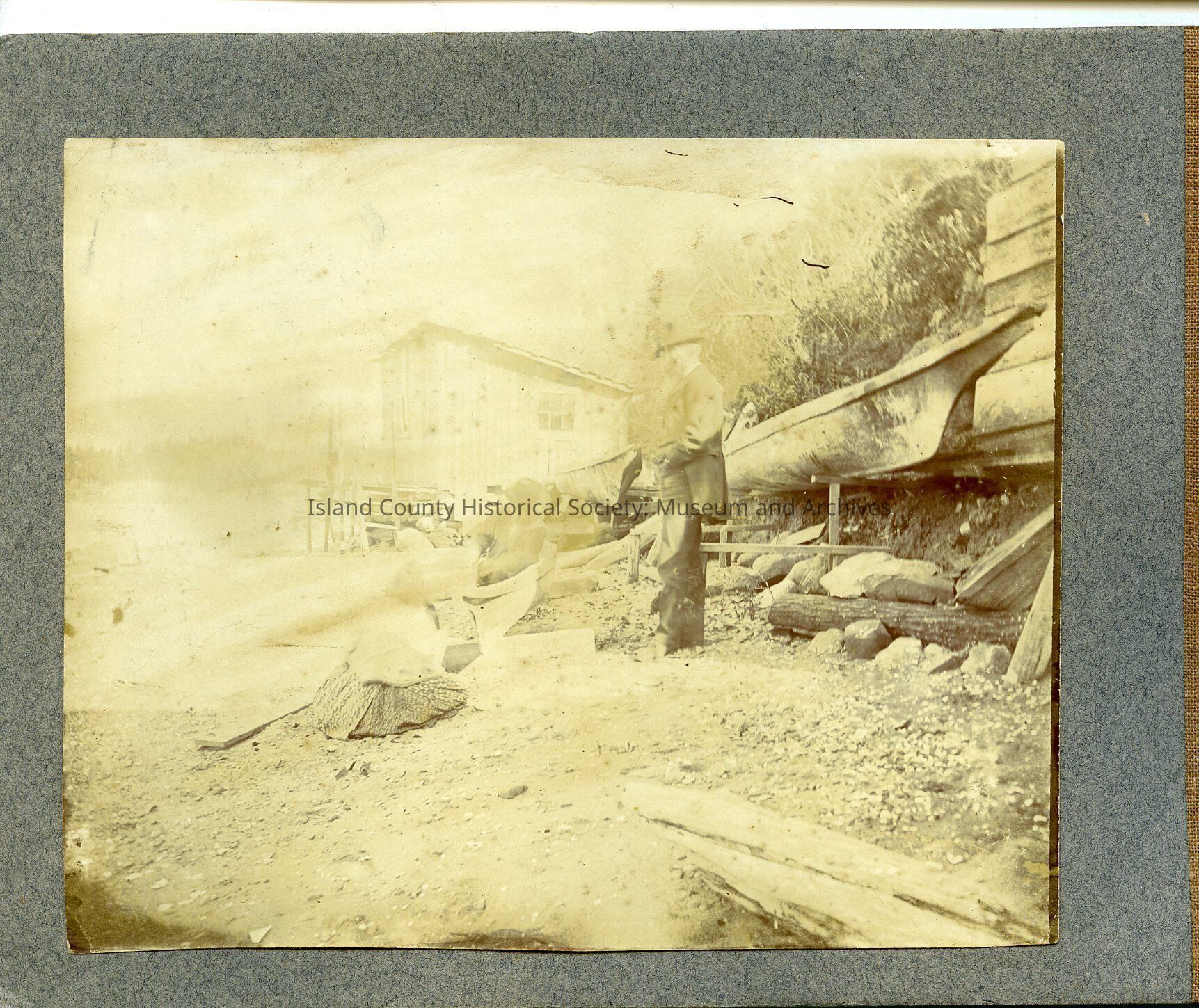 Three Native American canoes on the beach. One white male adult standing next to a canoe dressed in a long jacket and hat - this is possibly Paul Cunningham. There is an Indigenous man in a canoe, carving it out - this is possibly Charlie Snakelum. Next to the canoe is a woman with her back to the camera - possibly Katie Barlow Snakelum or Mary Snakelum. Wood shed next to the beach area. Included in a book of photographs collected by Lem Wanamaker given by Herman Wanamaker.