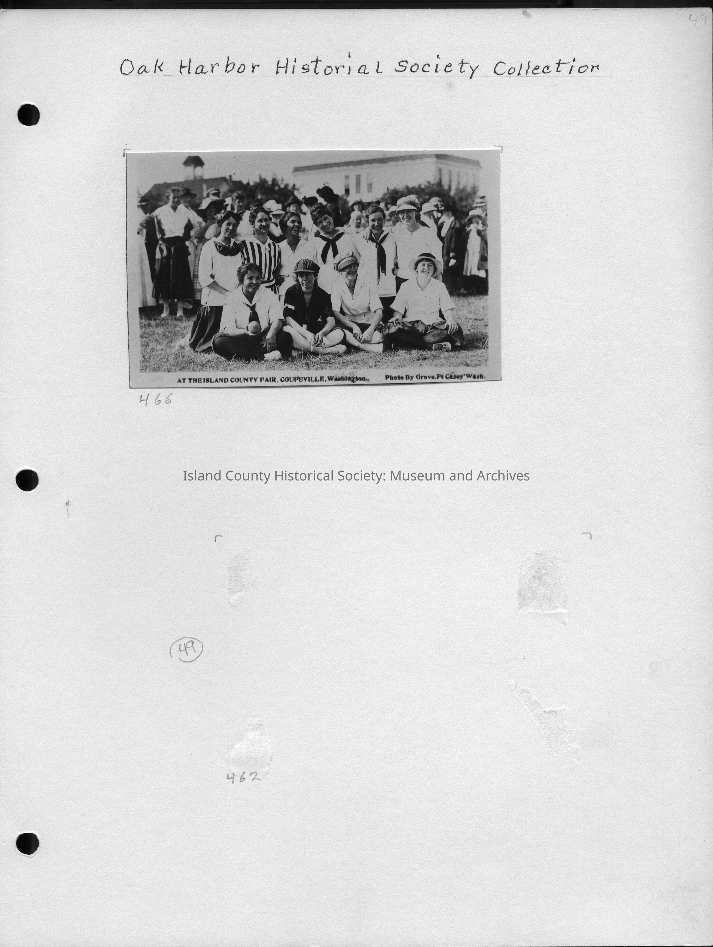 Top Photo - 4.25"W x 2.75"H - Group photo of 10 women kneeling/sitting on the grass at the Island County Fair in Coupeville. The women are wearing white shirts and ties and appear to be part of a softball team. One woman in the first row is holding a softball. No date.