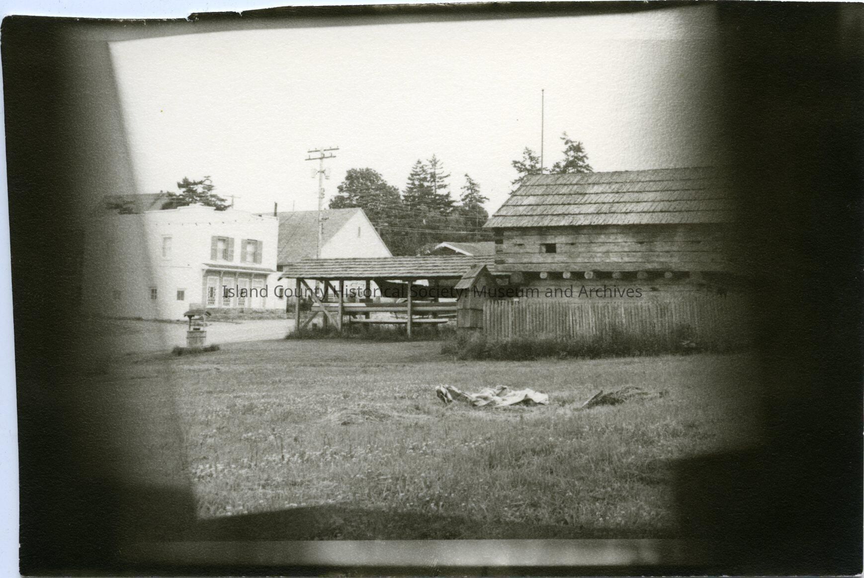 Alexander blockhouse from along the bluff. Can see the old Firehouse and Rec Hall. Canoes in the boat shed. Picket fence around part of the blockhouse.