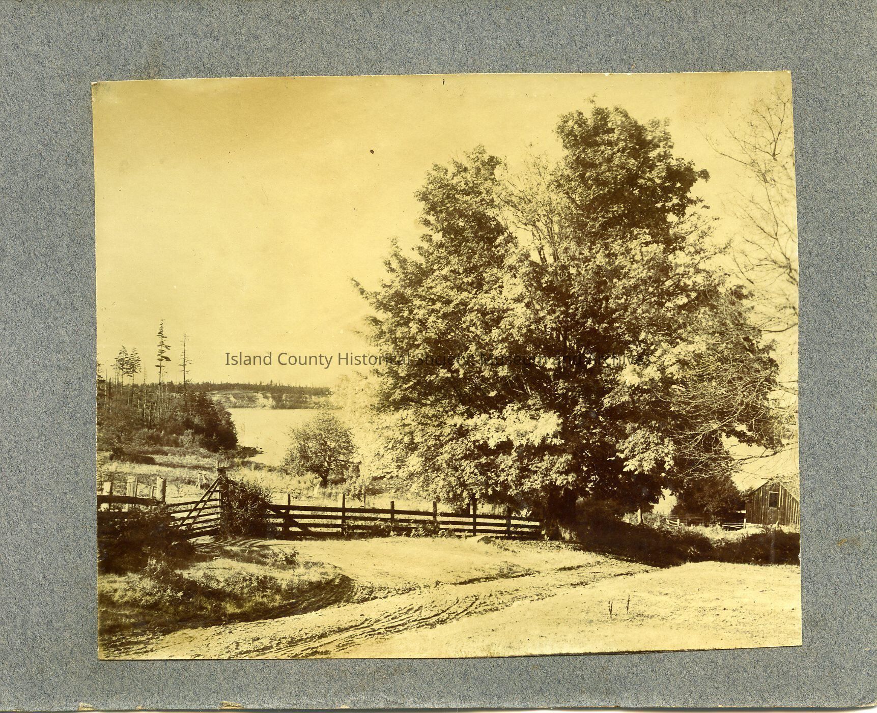 A picture of a tree and a fence, with water in the background. Part of a book of photographs collected by Lem Wanamaker.