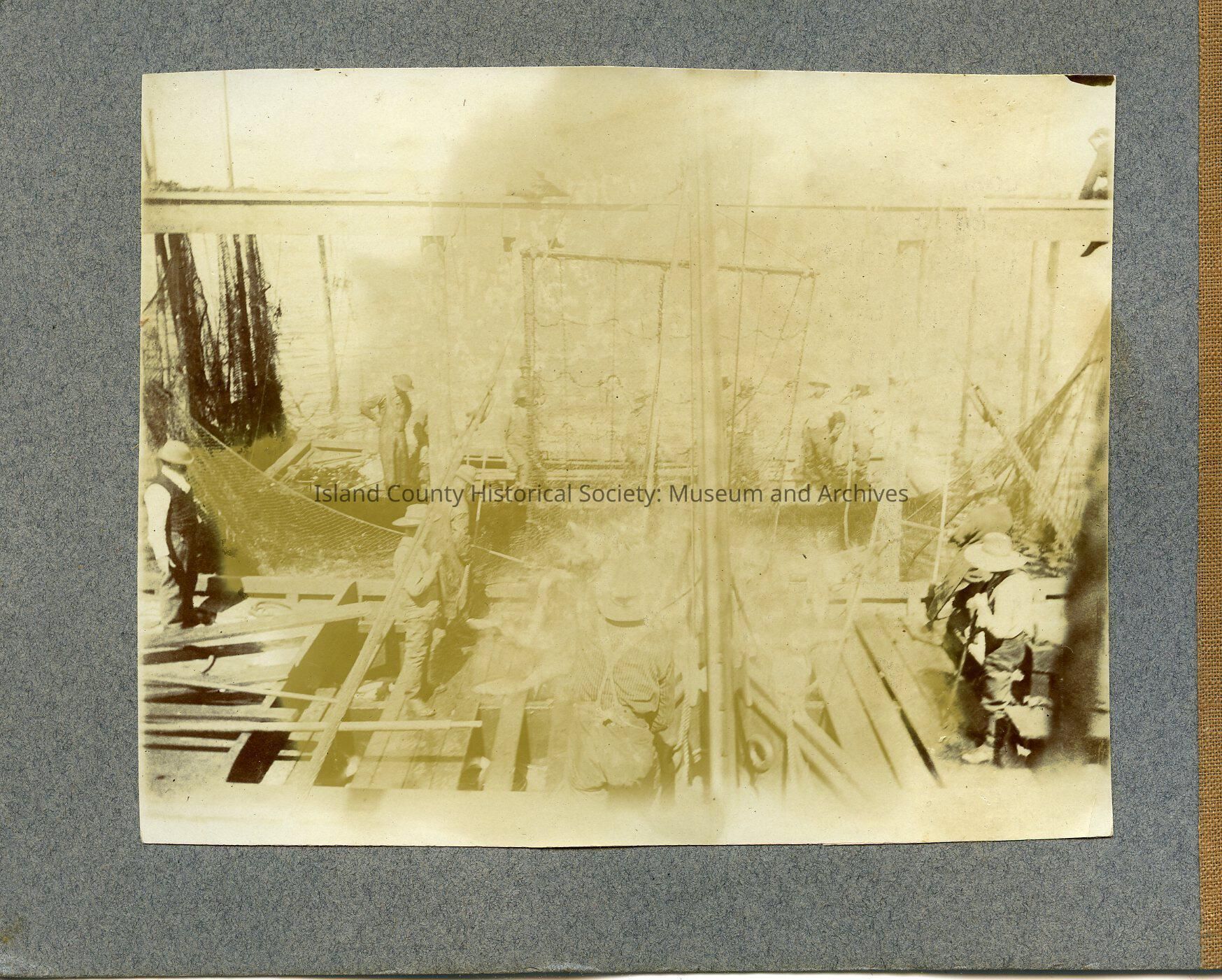 Photo shows an aerial view of the fishing boat with nets and people. Image found in book of photographs collected by Lem Wanamaker Given by Herman Wanamaker.