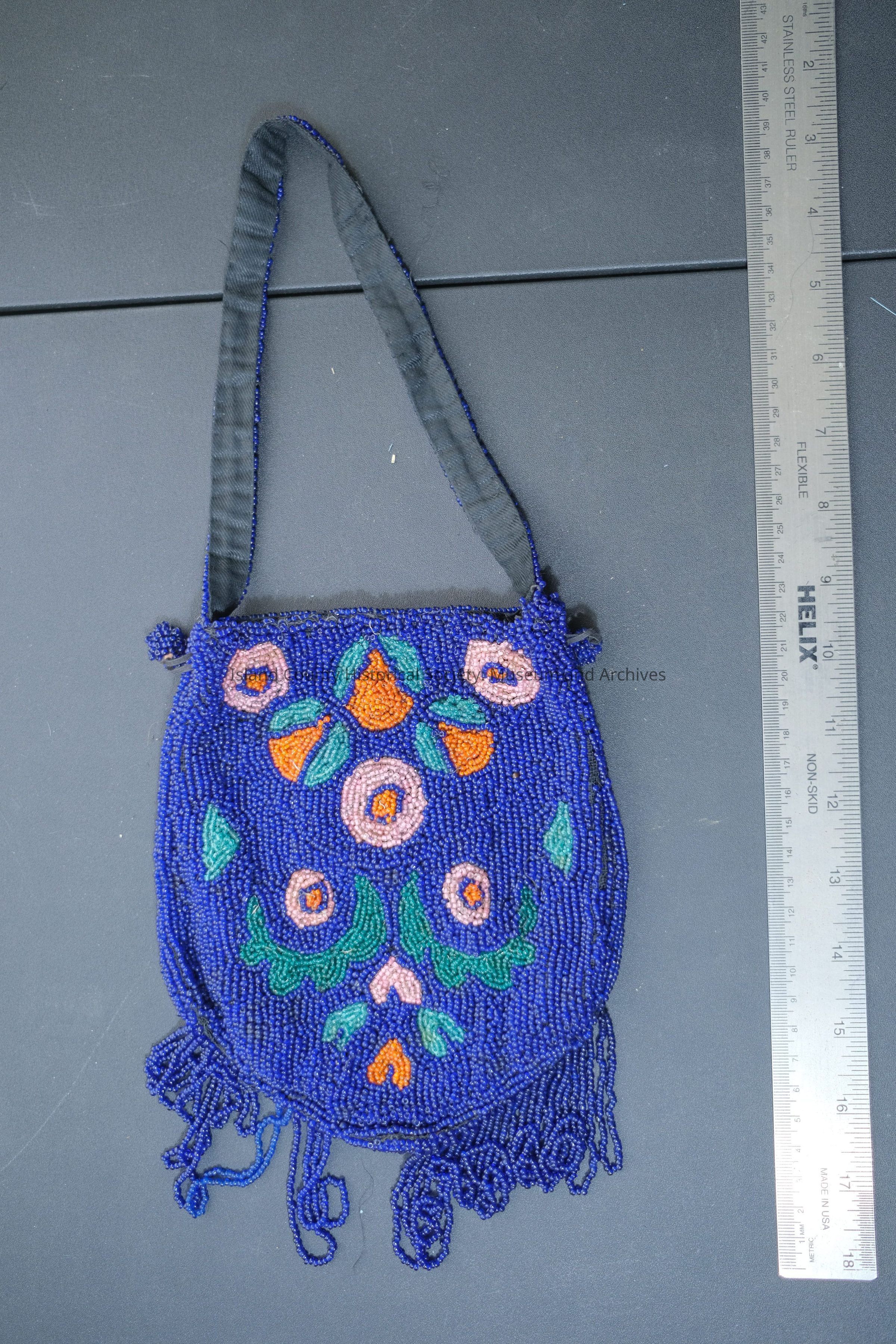 bright blue beaded evening bag w/ orange/teal/turquiose/pink design