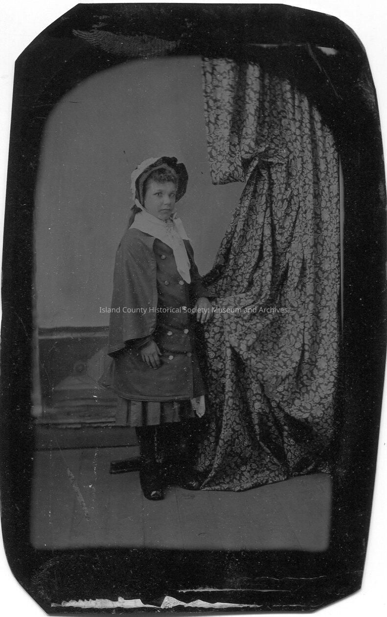 Tintype of a very young woman or older girl in a coat with a cape, hat/bonnet, scarf, skirt and shoes or boots. She is standing beside a floral drapery with her arm resting on a table or other object under the drapery.